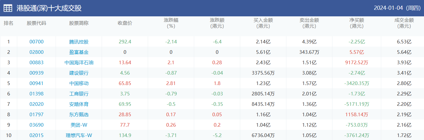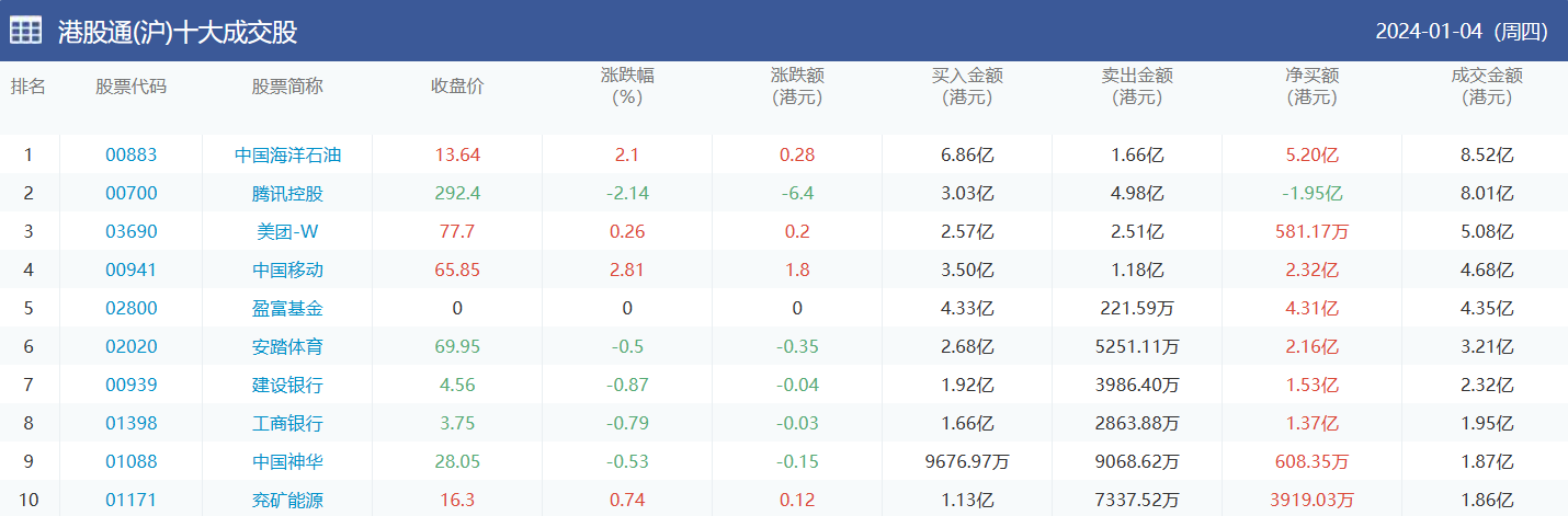 亚汇网实时数据统计:截至1月5日收盘中国海洋石油、腾讯控股、美团-w位居港股通(沪)成交前三,腾讯控股、盈富基金、中国海洋石油位居股通(深)成交前三。