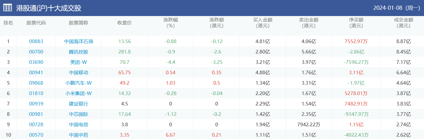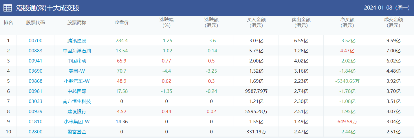 亚汇网实时数据统计:截至1月9日收盘中国海洋石油、腾讯控股、美团-w位居港股通(沪)成交前三,腾讯控股、中国海洋石油、中国移动位居股通(深)成交前三。
