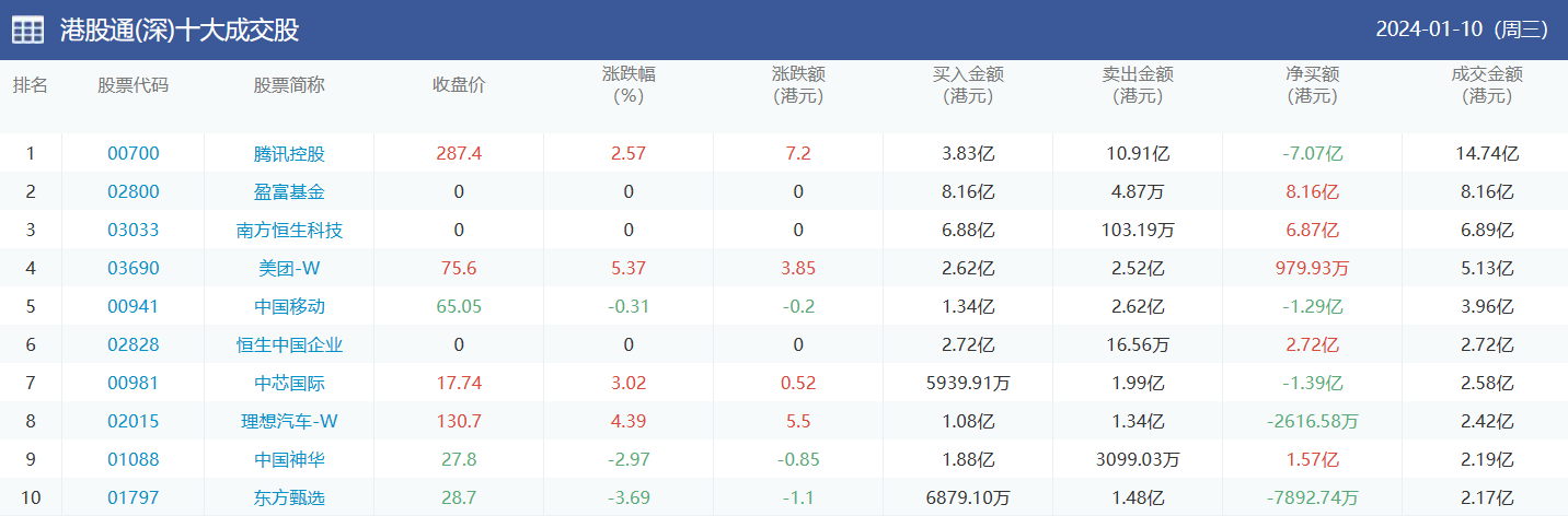 亚汇网实时数据统计:截至1月11日收盘腾讯控股、美团-w、建设银行位居港股通(沪)成交前三,腾讯控股、盈富基金、南方恒生科技位居股通(深)成交前三。