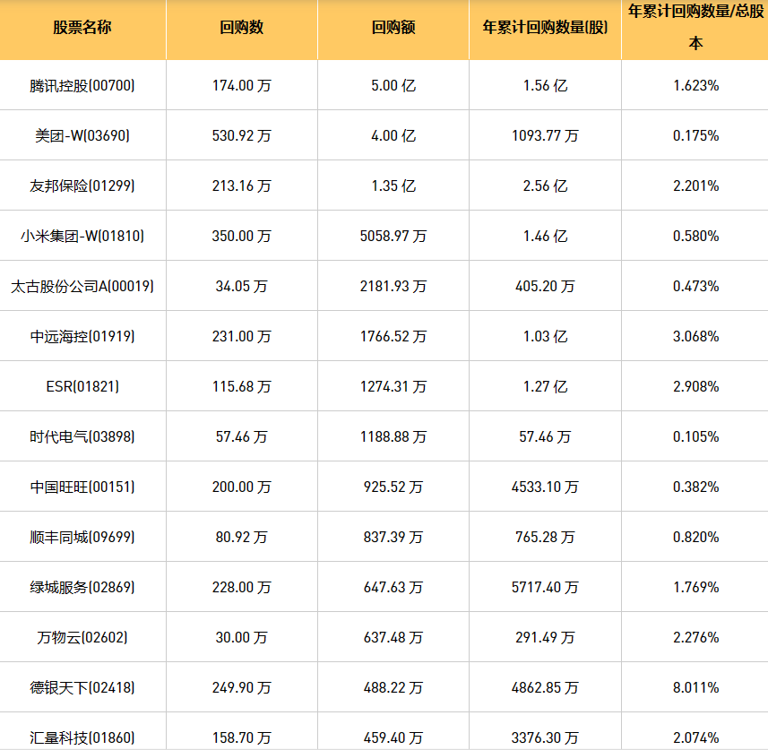 1月12日港股回购概况:旭辉永升服务(01995)、北控城市资源(03718)、上实城市开发(00563)、天福(06868)、清科创业(01945)、龙源电力(00916)、理文造纸(02314)、微泰医疗-B(02235)、腾讯控股(00700)、绿城服务(02869)、力劲科技(00558)、时代电气(03898)、上海石油化工股份(00338)、中远海控(0)、创维集团(00751)、中国旺旺(00151)、太古股份公司A(00019)、复星国际(00656)、联康生物科技集团(00690)、亿都(国际控股)(00259)、太古股份公司B(00087)、彩客新能源(01986)、歌礼制药-B(01672)、首程控股(00697)、旭日企业(00393)、天鸽互动(01980)、德银天下(02418)、美团-W(03690)、友邦保险(01299)、天立国际控股(01773)、赛晶科技(00580)、小米集团-W(01810)、万物云(02602)、丽珠医药(01513)、首惠产业金融(00730)、汇量科技(01860)、顺丰同城(09699)、美亨实业(01897)、康圣环球(09960)、康基医疗(09997)、ESR(01821)于2024年1月11日进行了回购。其中,回购金额最大的为腾讯控股(00700),回购数量174.00 万,回购金额5.00 亿元。
