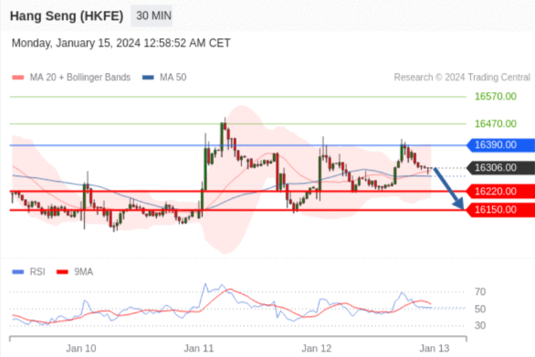 香港恒生指数期货 (F4) 当日内交易策略: 在 16390.00 之下 目标价位为 16220.00(20240115)