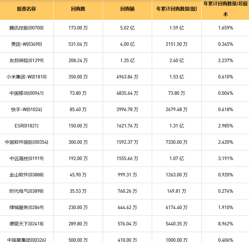 1月16日港股回购概况:摩比发展(00947)、时代电气(03898)、上实城市开发(00563)、创维集团(00751)、中远海控(0)、龙源电力(00916)、中国星集团(00326)、力劲科技(00558)、清科创业(01945)、亿都(国际控股)(00259)、友邦保险(01299)、中石化炼化工程(02386)、汇量科技(01860)、彩客新能源(01986)、北控城市资源(03718)、思考乐教育(01769)、旭辉永升服务(01995)、IGG(00799)、绿城服务(02869)、腾讯控股(00700)、德银天下(02418)、太古股份公司A(00019)、美亨实业(01897)、美团-W(03690)、太古股份公司B(00087)、星盛商业(06668)、歌礼制药-B(01672)、联康生物科技集团(00690)、旭日企业(00393)、中国移动(00941)、先声药业(02096)、朝聚眼科(02219)、亚洲联网科技(00679)、小米集团-W(01810)、天立国际控股(01773)、快手-W(01024)、欧康维视生物-B(01477)、健倍苗苗(02161)、金山软件(03888)、ESR(01821)、顺丰同城(09699)、康基医疗(09997)、首惠产业金融(00730)、中国软件国际(00354)、康圣环球(09960)、天鸽互动(01980)于2024年1月15日进行了回购。其中,回购金额最大的为腾讯控股(00700),回购数量173.00 万,回购金额5.02 亿元。