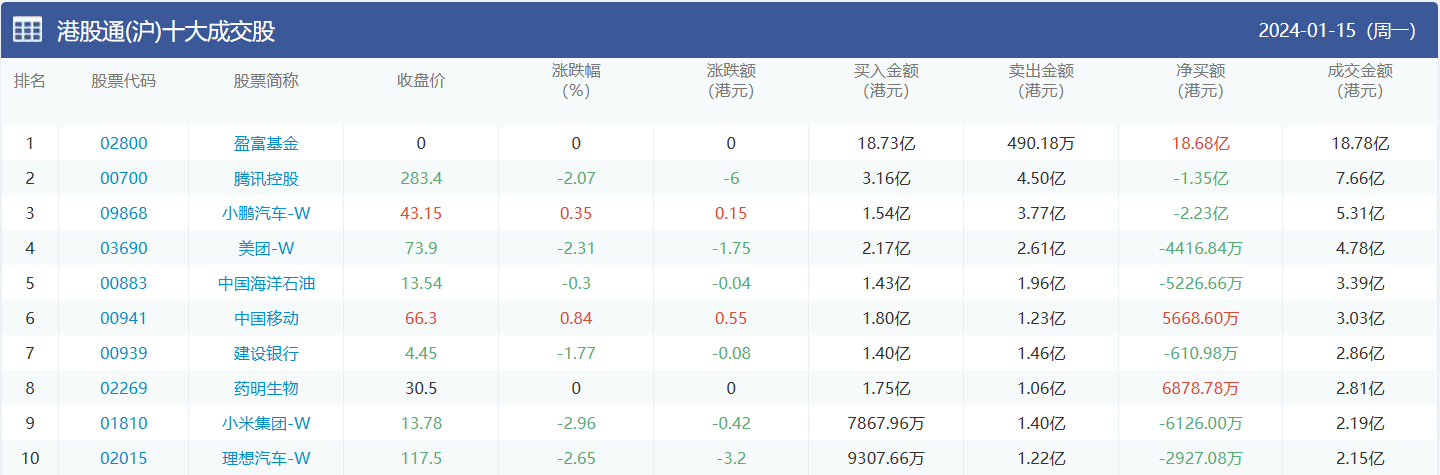 亚汇网实时数据统计:截至1月16日收盘腾讯控股、美团-w、中国海洋石油位居港股通(沪)成交前三,盈富基金、腾讯控股、小鹏汽车-w位居股通(深)成交前三。