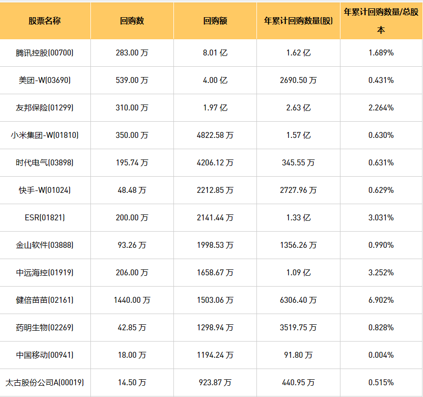 1月17日港股回购概况:摩比发展(00947)、旭辉永升服务(01995)、上实城市开发(00563)、时代电气(03898)、先声药业(02096)、龙源电力(00916)、中国软件国际(00354)、创维集团(00751)、北控城市资源(03718)、天鸽互动(01980)、中国星集团(00326)、绿城服务(02869)、中远海控(0)、太古股份公司A(00019)、IGG(00799)、亿都(国际控股)(00259)、腾讯控股(00700)、彩客新能源(01986)、中国移动(00941)、亚洲联网科技(00679)、美亨实业(01897)、歌礼制药-B(01672)、联康生物科技集团(00690)、太古股份公司B(00087)、复星国际(00656)、创梦天地(01119)、友邦保险(01299)、旭日企业(00393)、德银天下(02418)、美团-W(03690)、顺丰同城(09699)、丽珠医药(01513)、首惠产业金融(00730)、快手-W(01024)、诺诚健华(09969)、永达汽车(03669)、汇量科技(01860)、星盛商业(06668)、小米集团-W(01810)、ESR(01821)、健倍苗苗(02161)、赛晶科技(00580)、现代牙科(03600)、药明生物(02269)、康基医疗(09997)、欧康维视生物-B(01477)、金山软件(03888)、阜丰集团(00546)、天立国际控股(01773)、康圣环球(09960)于2024年1月16日进行了回购。其中,回购金额最大的为腾讯控股(00700),回购数量283.00万,回购金额8.01亿元。