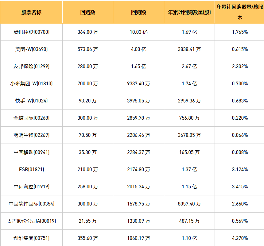 1月19日港股回购概况:摩比发展(00947)、龙源电力(00916)、资本策略地产(00497)、绿城服务(02869)、北控城市资源(03718)、中远海控(0)、中国旭阳集团(01907)、中国软件国际(00354)、友邦保险(01299)、创维集团(00751)、亿都(国际控股)(00259)、腾讯控股(00700)、中国移动(00941)、汇量科技(01860)、泡泡玛特(09992)、创梦天地(01119)、旭辉永升服务(01995)、清科创业(01945)、复星国际(00656)、首惠产业金融(00730)、旭日企业(00393)、理文造纸(02314)、金蝶国际(00268)、德银天下(02418)、联康生物科技集团(00690)、津上机床中国(01651)、天鸽互动(01980)、美团-W(03690)、VESYNC(02148)、歌礼制药-B(01672)、奈雪的茶(02150)、先声药业(02096)、丽珠医药(01513)、阜丰集团(00546)、美亨实业(01897)、天立国际控股(01773)、太古股份公司A(00019)、赛晶科技(00580)、ESR(01821)、金山软件(03888)、小米集团-W(01810)、太古股份公司B(00087)、盛业(06069)、敏华控股(01999)、永达汽车(03669)、雍禾医疗(02279)、快手-W(01024)、顺丰同城(09699)、金阳新能源(01121)、康圣环球(09960)、药明生物(02269)、康基医疗(09997)、欧康维视生物-B(01477)、现代牙科(03600)于2024年1月18日进行了回购。其中,回购金额最大的为腾讯控股(00700),回购数量364.00 万,回购金额10.03 亿元。