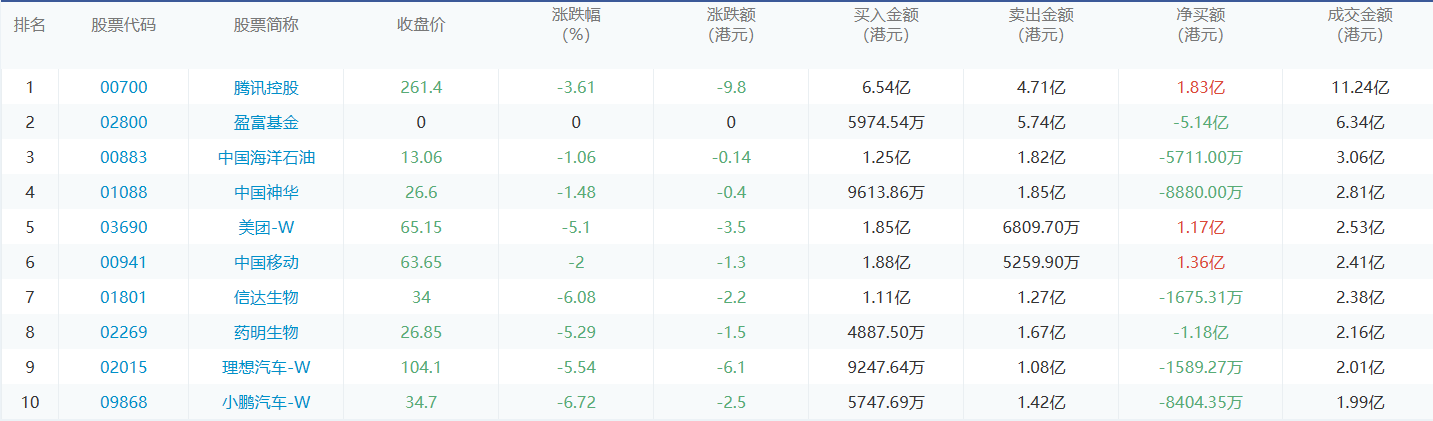 亚汇网1月22日港股通数据统计显示:腾讯控股净买入额居首,达6.54亿港元,盈富基金净卖出额居第一位。