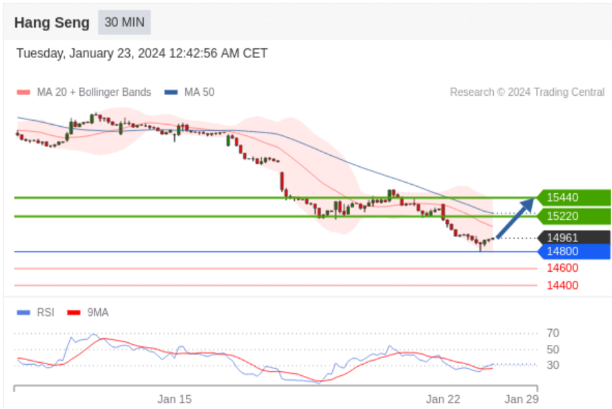 交易策略: 在 14800 之上,作多,目标价为 15220,第二目标价为 15440。