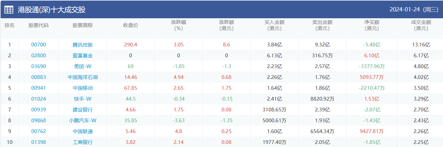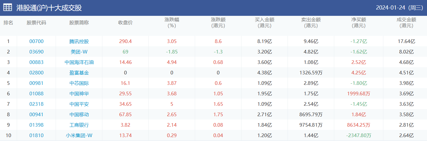 亚汇网实时数据统计:截至1月25日收盘腾讯控股、美团-w、中国海洋石油位居港股通(沪)成交前三,腾讯控股、盈富基金、美团-w位居股通(深)成交前三。