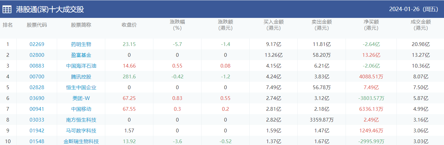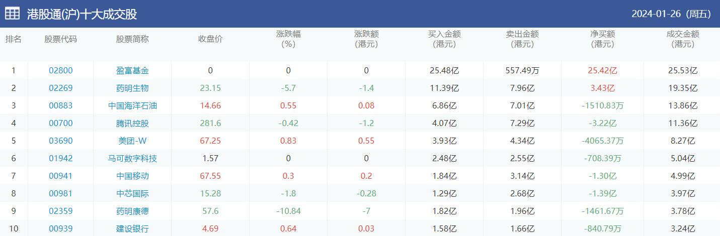 亚汇网实时数据统计:截至1月29日收盘盈富基金、药明生物、中国海洋石油位居港股通(沪)成交前三,药明生物、盈富基金、中国海洋石油位居股通(深)成交前三。