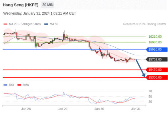 香港恒生指数期货 (G4) 当日内交易策略: 在 15920.00 之下 目标价位为 15470.00(20240131)