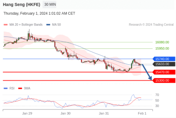 香港恒生指数期货 (G4) 当日内交易策略: 在 15740.00 之下 目标价位为 15470.00(20240201)