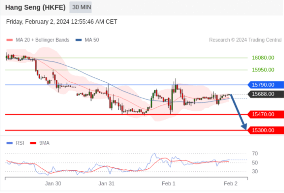 交易策略: 在 15790.00 之下,看跌,目标价位为 15470.00 ,然后为 15300.00 。