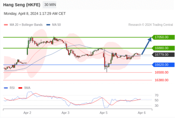 香港恒生指数期货 (J4) 当日内交易策略: 在 16620.00 之上 目标价位为 16880.00(20240408)
