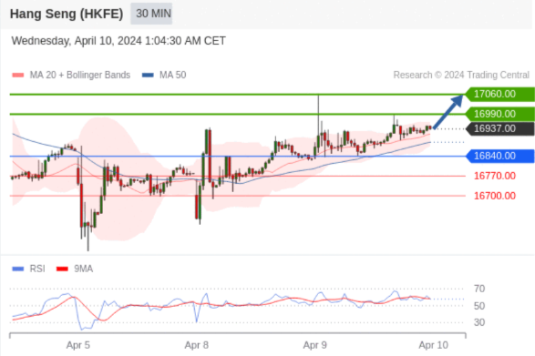 香港恒生指数期货 (J4) 当日内交易策略: 在 16840.00 之上 目标价位为 16990.00(20240410)