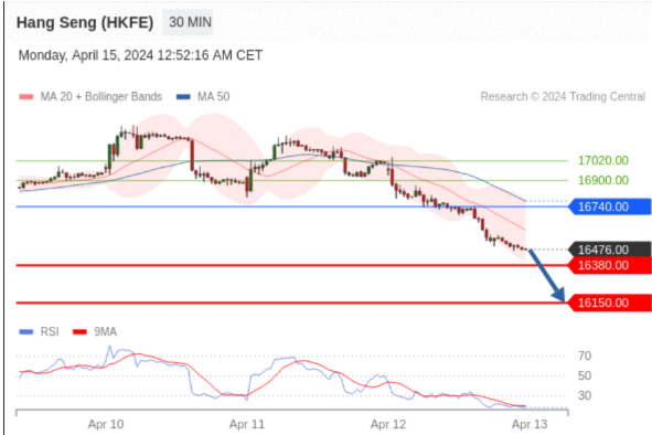香港恒生指数期货 (J4) 当日内交易策略: 在 16740.00 之下 目标价位为 16380.00(20240415)