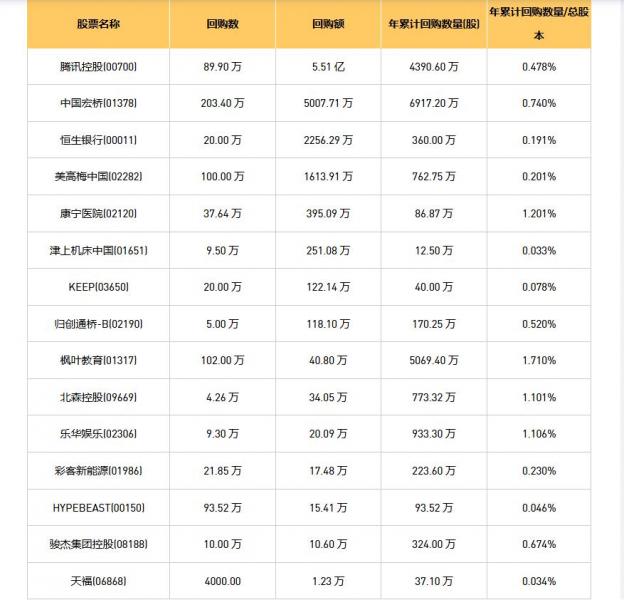 HYPEBEAST(00150)、津上机床中国(01651)、归创通桥-B(02190)、清科创业(01945)、天福(06868)、旭日企业(00393)、北森控股(09669)、四洲集团(00374)、美高梅中国(02282)、腾讯控股(00700)、恒生银行(00011)、骏杰集团控股(08188)、彩客新能源(01986)、乐华娱乐(02306)、枫叶教育(01317)、KEEP(03650)、康宁医院(02120)、中国宏桥(01378)于2025年8月26日进行了回购。其中,回购金额最大的为腾讯控股(00700),回购数量89.90 万,回购金额5.51 亿元。